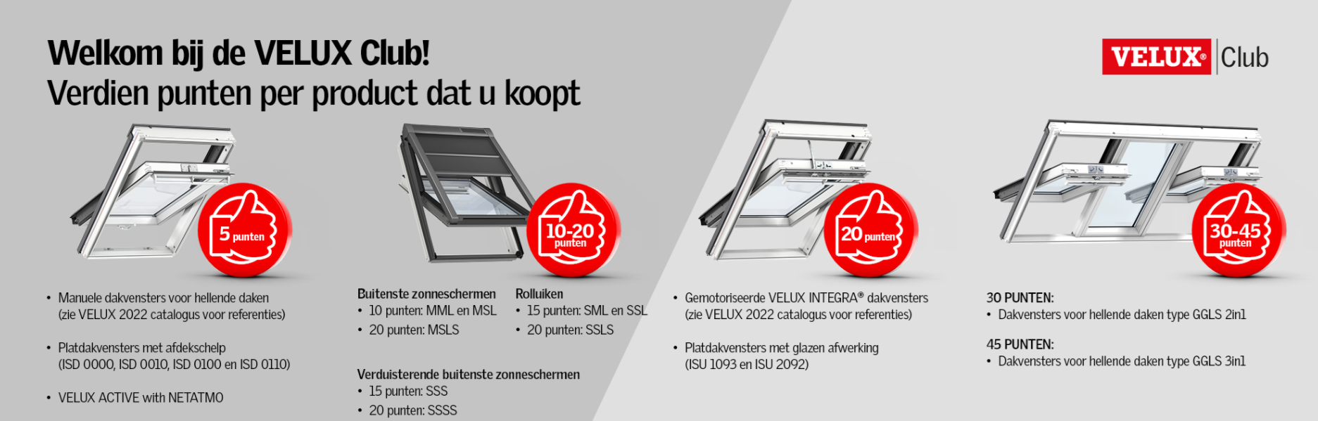 Volgende productcategorieën vallen buiten VELUX Club: toebehoren, lichttunnels, ontrokingsysteem voor platte daken en modulaire lichtstraten.